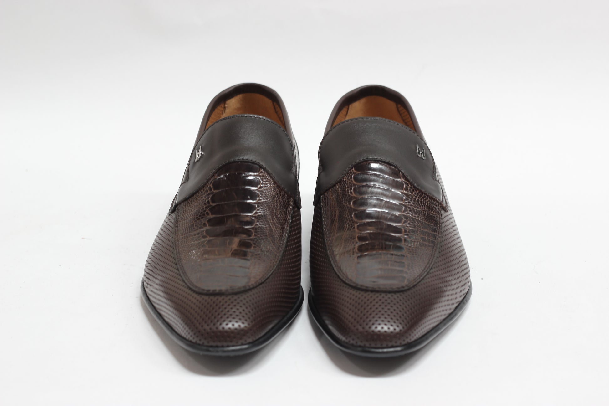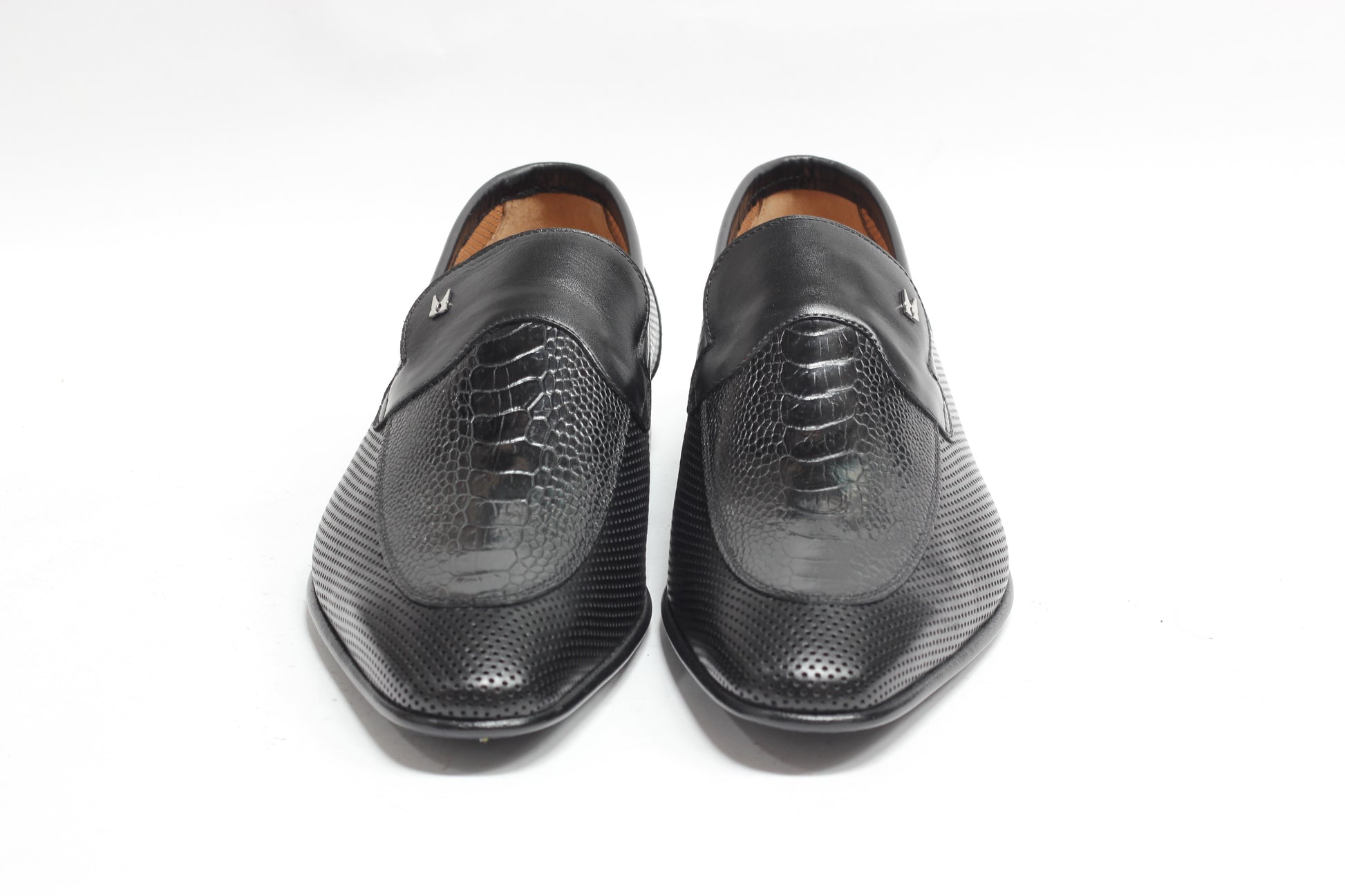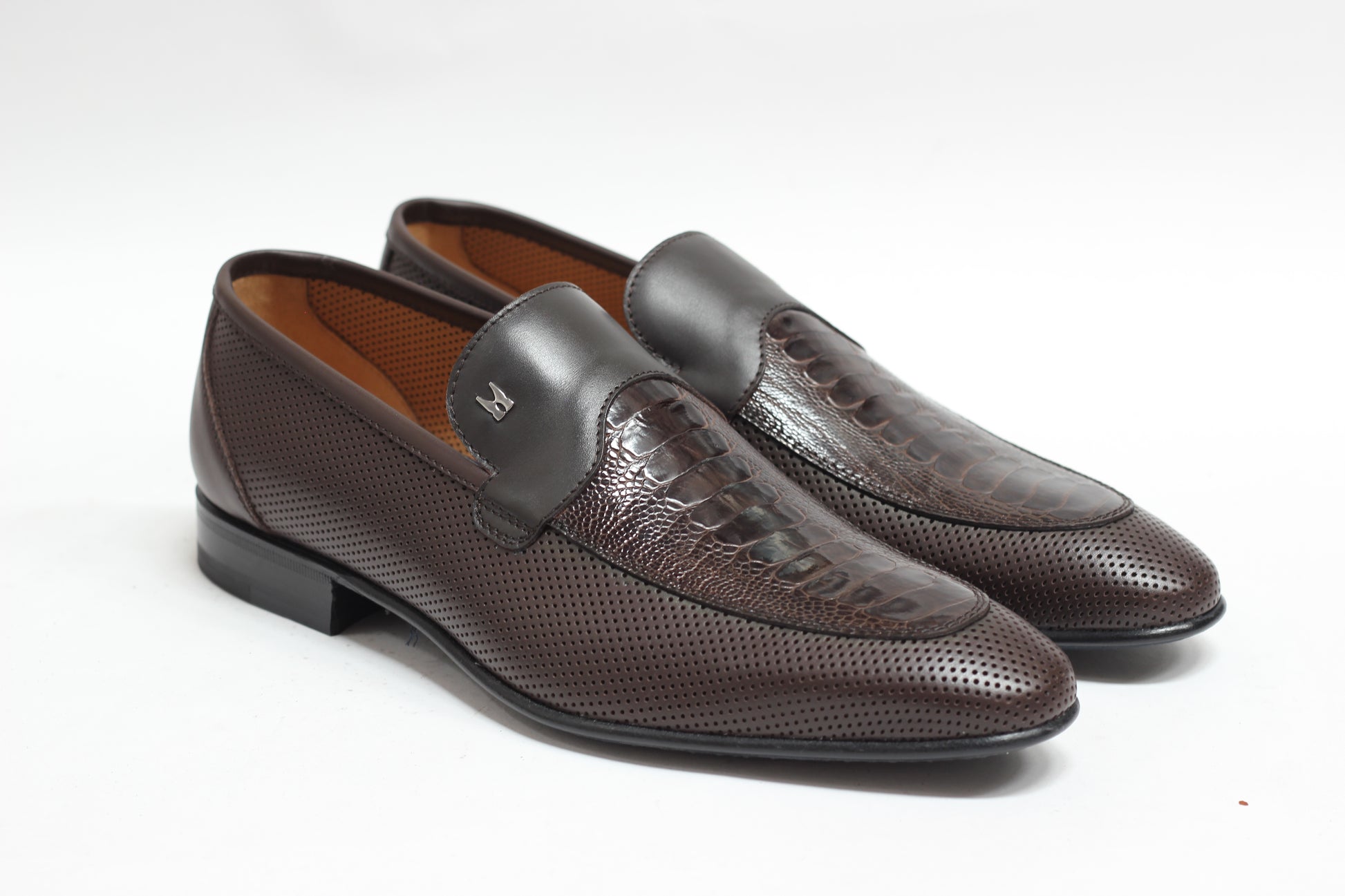 A geniune Ostrich leg leather insert in vamp and a blake stitched leather sole completes this Loafer nicly.